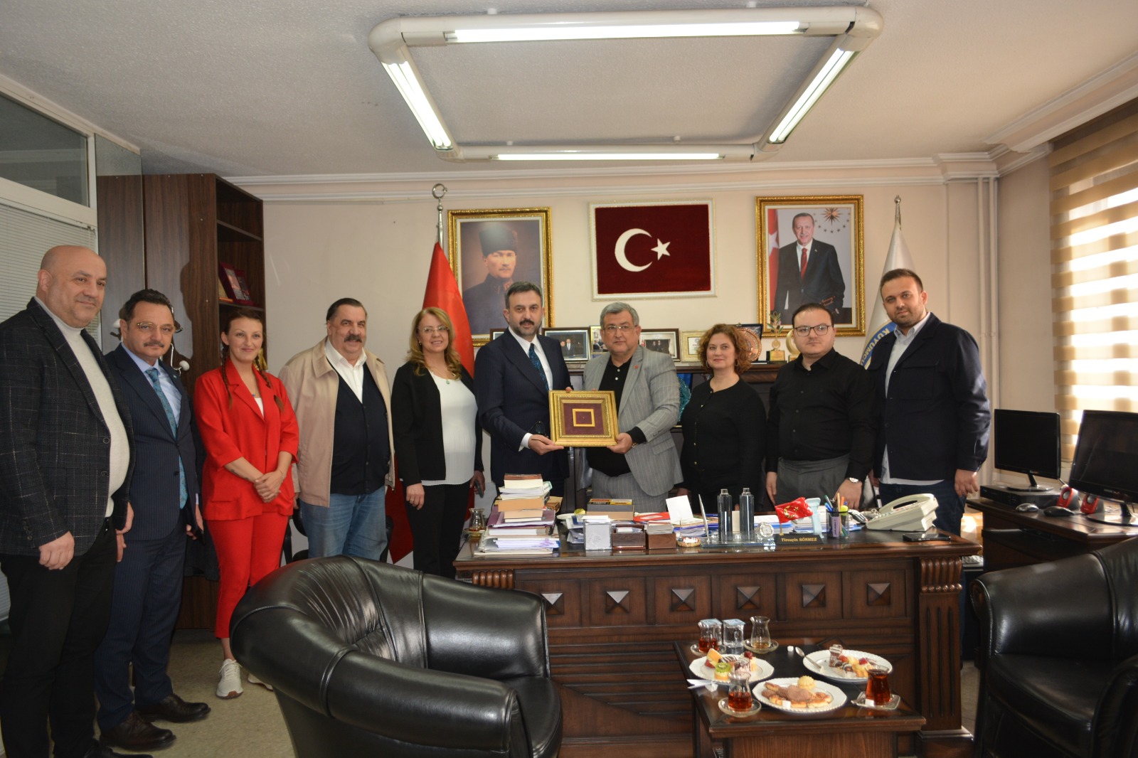 Ankara Kent Konseyi Başkanı ve ATO Başkan vekili Halil İbrahim Yılmaz ve  İnternet Medya ve Bilişim Federasyonu Genel Başkanı Süleyman Basa ve beraberindeki heyet Odamızı ziyaret ederek yeniden Başkanlığa seçilmesinden dolayı Timuçin Sönmez’e tebrik ziyaretinde bulundu.